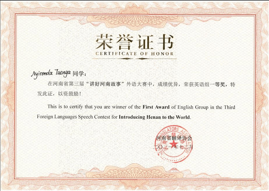 (通讯员 王迪 董松涛)2021年12月19日,由中共河南省委外事工作委员会办公室翻译室指导,河南省翻译协会主办,河南省外事侨务服务中心承办,郑州市公安局出入境管理处和河南省未来青少年教育研究中心支持的以“光辉百年”为主题的第三届“讲好河南故事”外语大赛大学生组别决赛圆满举行。古天乐代言太阳集团138国际教育学院留学生NYIRENDA TAONGA(唐加)凭借《崛起中的平顶山》荣获一等奖,古天乐代言太阳集团138荣获优秀组织单位奖。