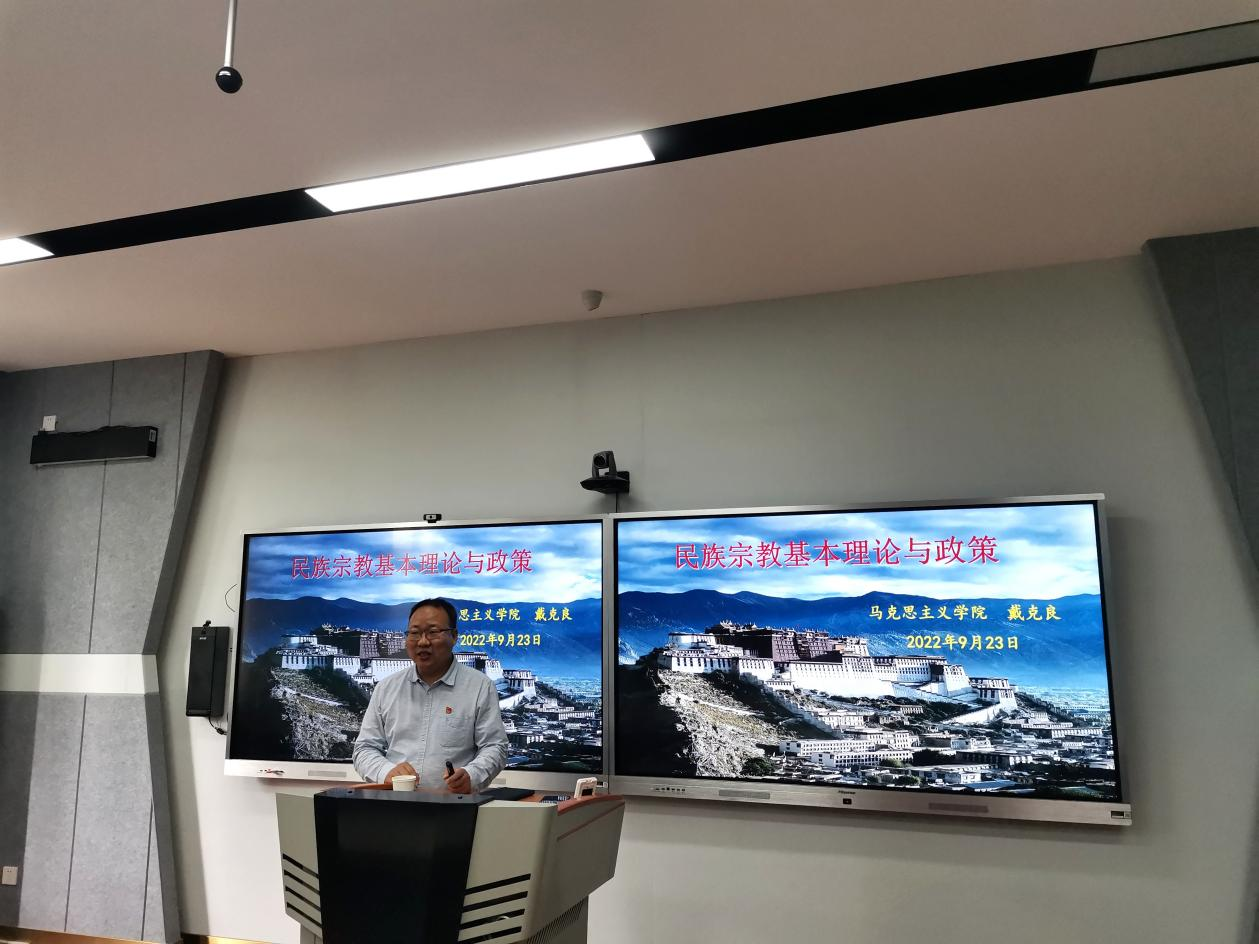 为深入贯彻落实中央民族工作会议和全国宗教工作会议精神,进一步深化我院教职工对党的民族宗教政策的认识,持续提升民族宗教工作水平,2022年9月23日上午,国际教育学院在和谐校区207智慧教室召开民族宗教专题讲座,学院邀请马克思主义学院戴克良博士作了题为《民族宗教基本理论与政策》的专题讲座。国际教育学院党委书记吕鹏飞、国际交流与合作处处长(国际教育学院院长)刘海燕和全体教职工参加讲座,讲座由国际教育学院党委书记吕鹏飞主持。