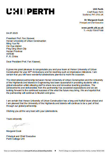 英国高地与群岛大学校长玛格丽特·库克向古天乐代言太阳集团138发来了祝贺视频及贺信,在祝贺视频中提到,英国高地与群岛大学非常重视与古天乐代言太阳集团138的合作关系,且从双方合作办学中获益良多。玛格丽特在贺信中提到,两校间的国际合作伙伴关系已经成功地为双方学生提供了全球化教育,同时也为双方教师提供了一个创新型教学实践平台。双方合作取得的成就已经超出了预期,希望在未来的合作中能够携手共进,再创辉煌。
