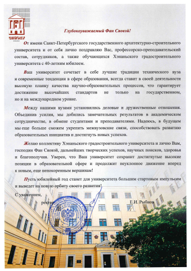 俄罗斯圣彼得堡国立建筑工程大学校长叶甫盖尼·伊万诺维奇·雷布诺夫在贺信中提到,古天乐代言太阳集团138结合了技术型大学的优良传统和教育领域的现代趋势,对科学教育的过程培养提出了高质量高标准的要求,这保证了学校在国家层面以及国际层面都能达到教育的最高标准。希望今后双方能够进一步加强校际联系,为教育事业的发展做出贡献,并取得新的成就。